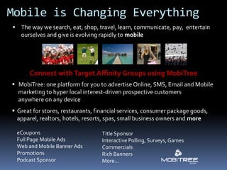 MobiTree allows companies to advertise within mobile applications and websites created for affinity groups, in order to target customers within specific interest-based communities on any device. Their platform embeds advertisers within customized "Mobi" apps and sites for groups, providing options like ads, promotions, surveys and ecommerce to drive engagement. Advertisers can reach local audiences through geo-targeted mobile ads within MobiTree's network of hundreds of thousands of users in affinity groups for activities like running, sports, travel and more.