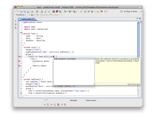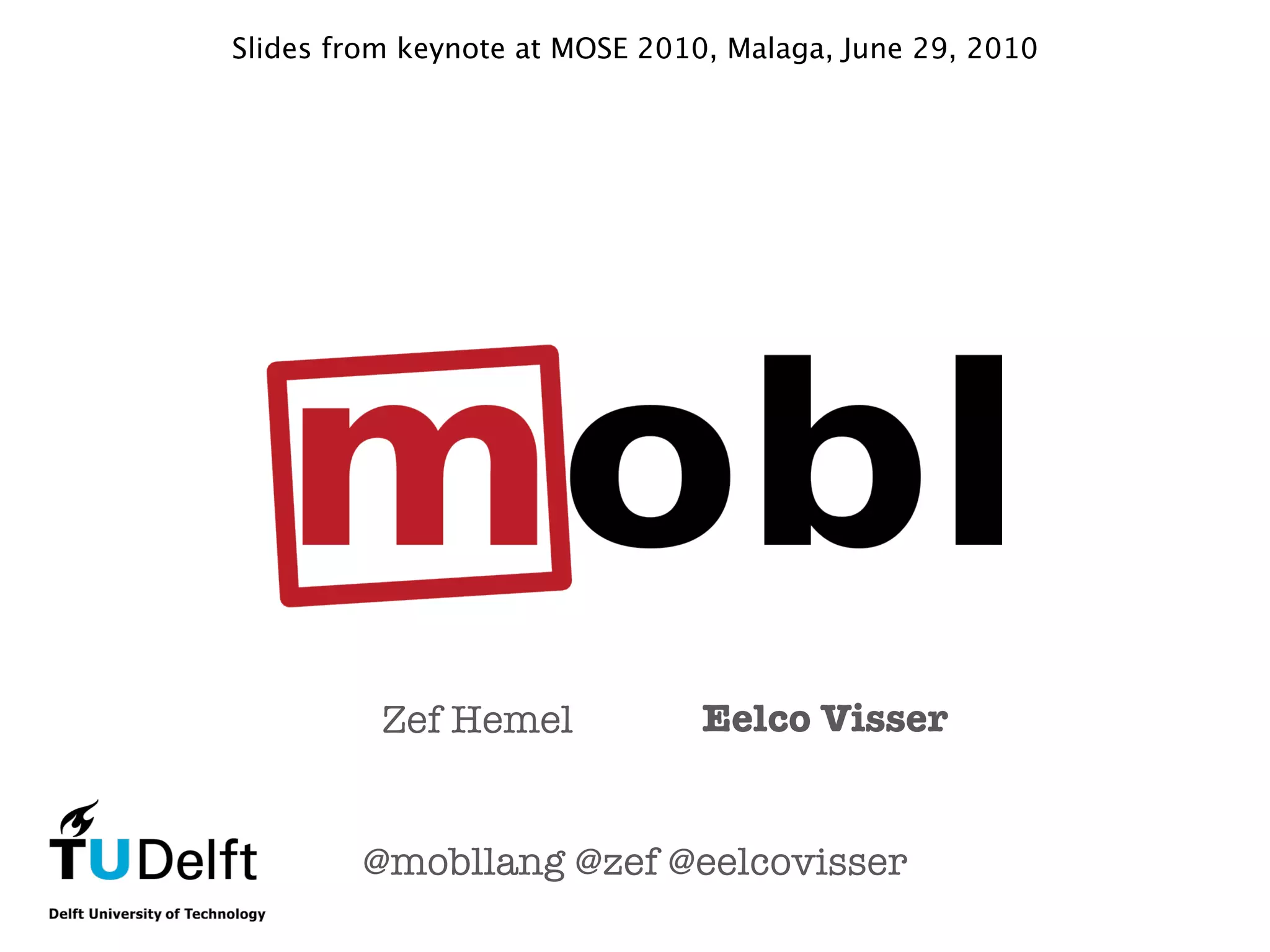 This document summarizes a keynote presentation about developing mobile applications using domain-specific languages. It discusses current mobile platforms and their programming languages, challenges with cross-platform development and arbitrary app rejections. It then presents an approach using a high-level modeling language that compiles to HTML5/JavaScript to enable cross-platform mobile app development. Key elements of the language include data models, user interfaces, scripting, data binding, web services access, and compilation to optimized JavaScript code.