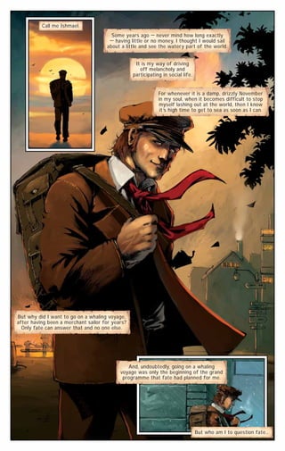 Ishmael arrives in a town looking for a room and is told the only option is sharing with the harpooner. The landlord assures him the harpooner won't be back that night. When a heavily tattooed man enters Ishmael's room late at night performing a ritual, Ishmael fears it is the harpooner. The next day, Ishmael joins the crew of the Pequod led by Captain Ahab, who is obsessed with hunting a particular whale.