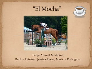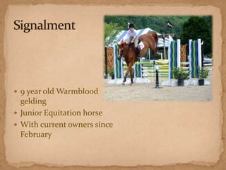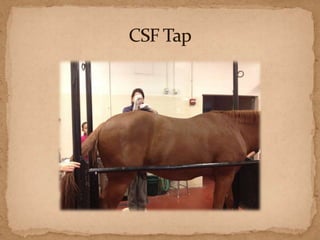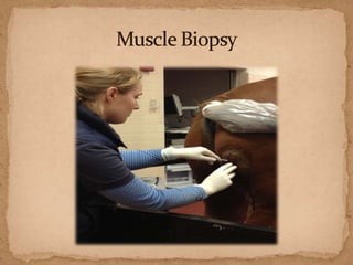 This document describes a case of a 9-year-old warmblood gelding presenting with progressive ataxia, weakness, and poor performance over 4-5 months. Physical examination revealed grade 1 ataxia and grade 2/5 lameness in the left front and right hind limbs. Differential diagnoses included neuropathy, myopathy such as polysaccharide storage myopathy (PSSM), and lameness. A muscle biopsy showed findings consistent with PSSM type 1. Treatment involves long-term dietary management to reduce glucose and insulin levels.