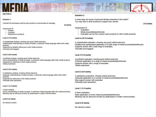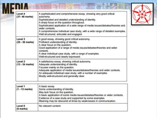 The document provides feedback on a mock exam, including possible mark bands and sample answers for three questions related to media studies. General feedback at the end emphasizes applying media theories and case studies from lessons to answers. For question 1 on contrasting communication techniques in advertisements, sample points discuss the use of intimate shots, diversity, and emotional connection in the Nexus ad, while the Bluefish ad encourages self-reflection through philosophical questions. Both aim to create intimacy, though through different techniques and messages. Students are advised to practice applying theories when analyzing media texts.
