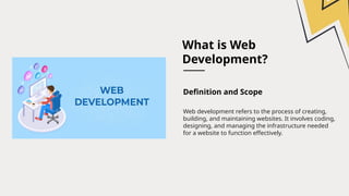 Web development encompasses the creation, building, and maintenance of websites, utilizing technologies such as HTML, CSS, and JavaScript for structure, style, and interactivity. It involves various components including web application languages, databases, and security measures, as well as the use of development tools throughout distinct phases from planning to maintenance. Understanding the roles of front-end, back-end, and full-stack development, as well as key protocols and security practices, is essential for effective web development.