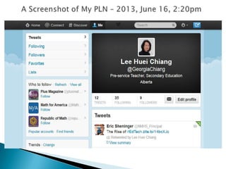 This document reflects on the author's experience using Twitter to develop their professional learning network. It discusses signing up for an account, following suggested organizations and people, and eventually feeling comfortable tweeting. The author refers to three accounts, @edutopia, @cybraryman1, and @cmt1, that have influenced their early education technology journey. @edutopia tweets about philosophical issues in education. @cybraryman1 tweets on a variety of topics from motivation to education technology to gifted education. @cmt1 tweets on education technology, research methodology, and emerging topics.