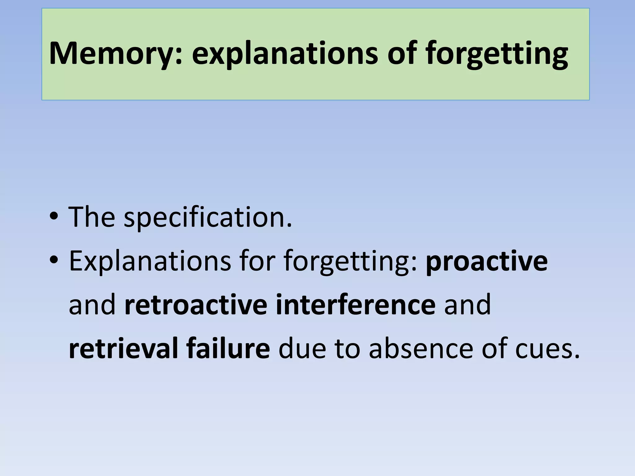 This document discusses explanations for forgetting, specifically retrieval failure due to the absence of cues. It explains that while information is stored in long-term memory, we can forget due to an inability to retrieve it without cues. Cues can be external contextual details or internal state-dependent details associated with the initial learning that help with recall. The encoding specificity principle holds that cues present during learning must also be present during retrieval attempts. A lack of cues results in cue-dependent forgetting.