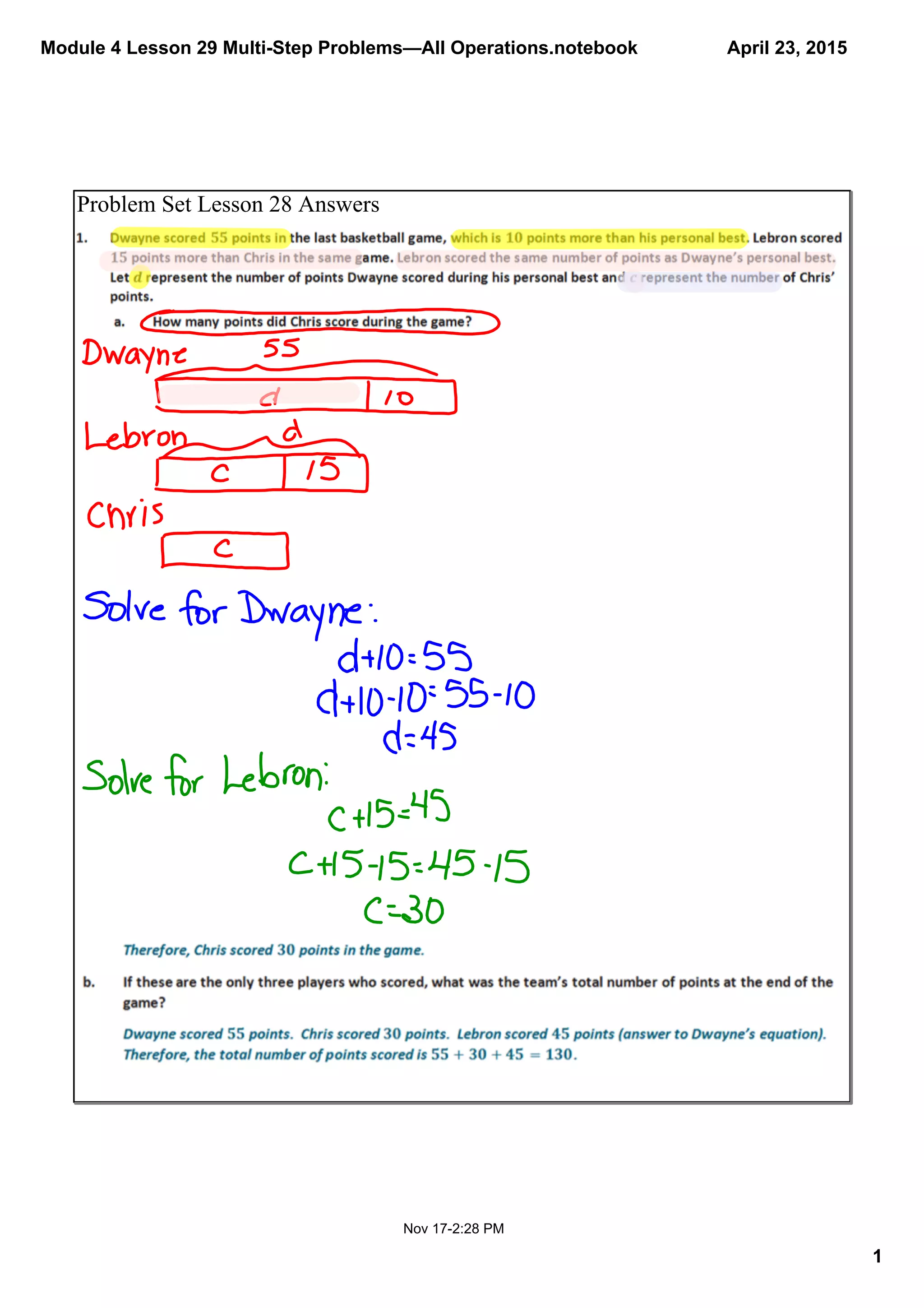 This document contains a lesson on solving multi-step word problems involving all operations through setting up tape diagrams and equations. The lesson includes an example problem about determining the number of different types of books in a library. Students are asked to draw tape diagrams to represent the information given in the word problem and set up an equation to arrive at the number of each type of book. Several similar practice problems are then provided for students to work through on their own. The document closes with reminders about efficiently solving these types of problems.