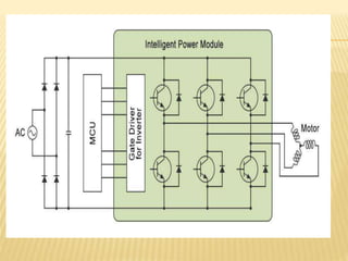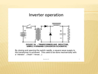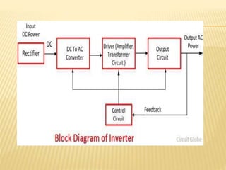 This document discusses different types of inverters. It describes inverters as static power converters that produce an AC output from a DC power supply and are used in applications like adjustable AC drives, UPS systems, and active power filters. The two main types are voltage source inverters (VSI) and current source inverters (CSI), depending on whether the input is a voltage source or current source, respectively. VSIs can control output voltage while CSIs directly control output current. Half bridge and full bridge are two common single-phase VSI configurations, with the full bridge having four operating states based on switch positions. Three-phase inverters are made up of three single-phase inverters connected to