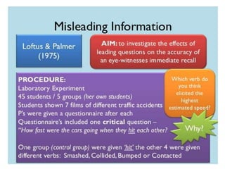 1. The accuracy of eyewitness testimony can be affected by misleading information like leading questions and post-event discussion.