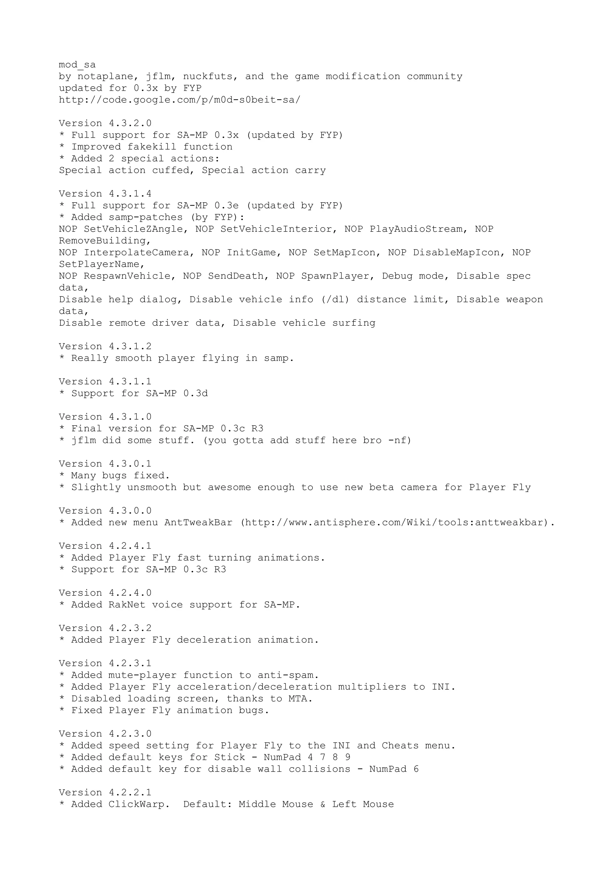 This document describes the changelog and release history for mod_sa, a modification for Grand Theft Auto: San Andreas that adds various cheats and enhancements. It lists over 50 different versions released between 2007-2014, with each release noting new features added such as improved flying controls, vehicle upgrades, special actions, and patches to San Andreas Multiplayer functionality. Major versions included support for different SA-MP versions and base games. The mod aims to provide full customization options while improving the gameplay experience.