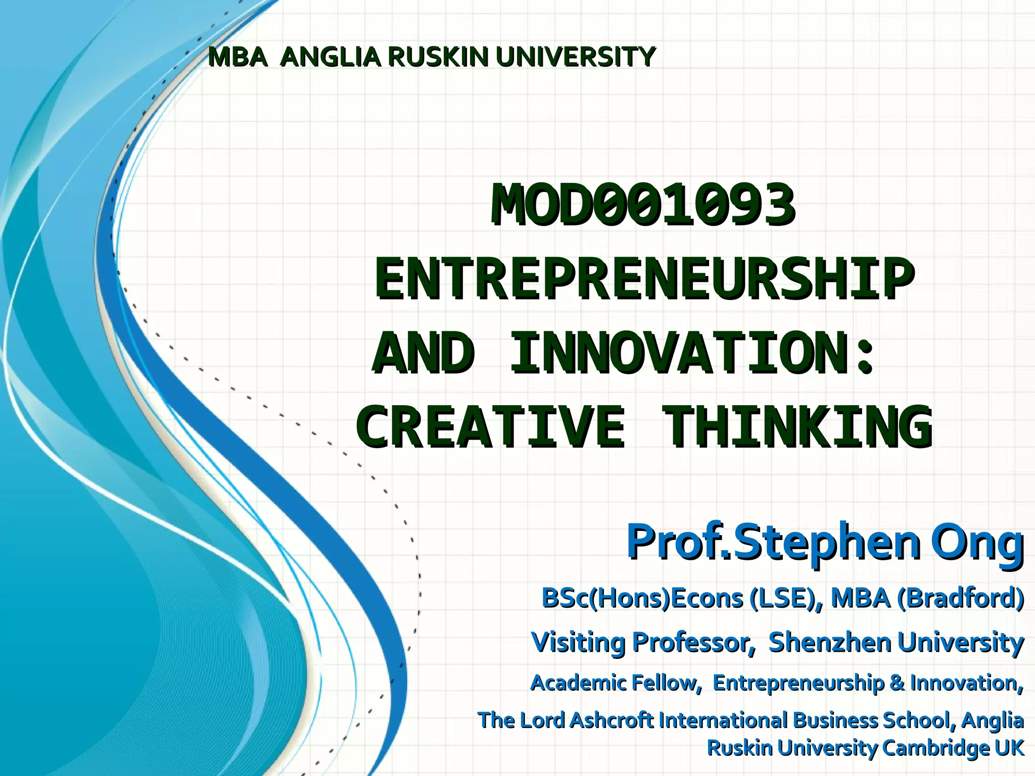 This document discusses creativity, innovation, and entrepreneurship. It defines creativity as developing new ideas, innovation as applying creative solutions, and entrepreneurship as connecting ideas to business opportunities. The creative process involves preparation, investigation, transformation, incubation, illumination, verification, and implementation. Techniques to enhance creativity include brainstorming, questioning assumptions, embracing failure, and obtaining diverse perspectives. Organizations can foster creativity by rewarding innovation and embracing diverse thinking.