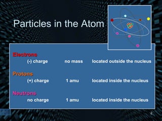 Each element is unique due to its atomic structure. Atoms consist of protons and neutrons located in the nucleus, and electrons outside the nucleus. The number of protons determines the element, while the total of protons and neutrons is the mass number. Isotopes are atoms of the same element with different numbers of neutrons.