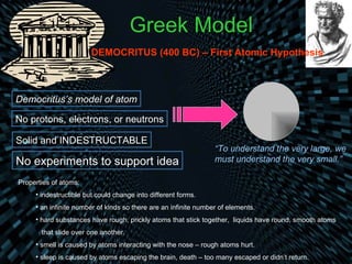 The document traces the history and development of atomic models from ancient Greek philosophers to modern quantum theory. It describes Democritus's early idea of indivisible atoms, followed by John Dalton formalizing the first atomic theory in the early 1800s. J.J. Thomson later discovered the electron and proposed that atoms are like "plum puddings" with positive matter and embedded electrons. Ernest Rutherford's gold foil experiment revealed that atoms have a small, dense positive nucleus, leading Niels Bohr to model electrons orbiting the nucleus in fixed shells. Modern quantum theory describes electrons as occupying probability clouds or orbitals around the nucleus.