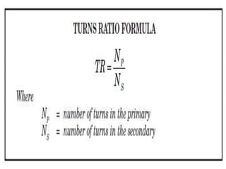 Transformers are electrical devices that increase or decrease alternating current (AC) voltages through the principle of electromagnetic induction. They consist of two coils - a primary coil and secondary coil - wrapped around an iron core. When an alternating current flows through the primary coil, it induces an alternating voltage in the secondary coil. The ratio of the number of turns in the primary coil to the number of turns in the secondary coil determines the ratio of the voltages. Transformers are used to efficiently transfer electrical power from one circuit to another while isolating the two circuits. Common transformer types include isolation transformers and autotransformers.