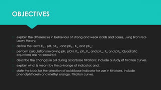This document outlines the key objectives and concepts around acid-base equilibria, including: