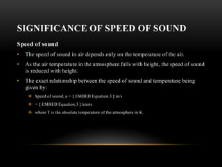 1) The document discusses the significance of the speed of sound in flight, defining subsonic, transonic, and supersonic flight based on Mach numbers.