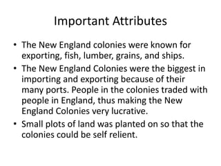 The document summarizes the key attributes and effects of trade and religious/intellectual movements on the three regions of the original 13 colonies - New England, Middle, and Southern colonies. The New England colonies exported fish, lumber, grains and ships and had many ports for international trade. The Middle colonies focused on agriculture and industry like grain farming and textile/iron production. The Southern colonies specialized in cash crops like tobacco, rice and sugar grown on large plantations worked by many slaves. The triangular trade helped the economies of all three regions through imports and exports. The Great Awakening and Enlightenment led to more religious freedom and new ideas that influenced governance and improved farming/business.