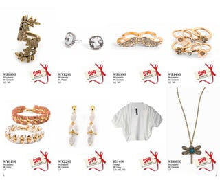 The document appears to be an inventory list containing over 100 items of clothing and accessories with details like codes, colors, sizes and prices. The items listed include blouses, dresses, skirts, pants, tops and accessories in various colors ranging from white, black, blue, red to more unique shades. The prices provided are in different currencies with most items priced between $99-$299. Sizes available for various items range from 32 to 40.