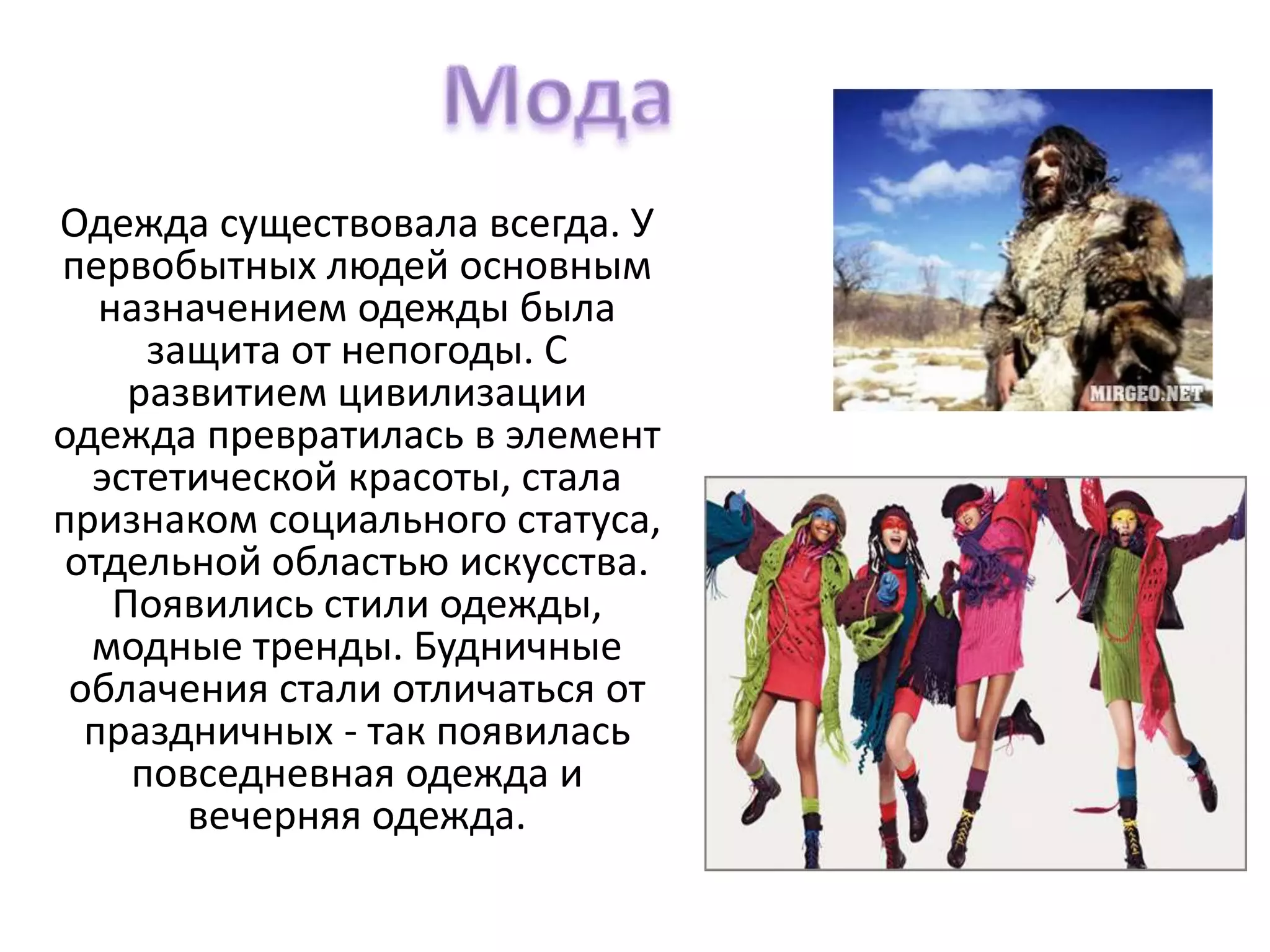 Документ описывает историю моды одежды, начиная с её первобытного назначения и заканчивая современными трендами интернет-шопинга. Отображается эволюция моды, включая влияние Петра I на российскую одежду и перечисление знаковых элементов, таких как мини-юбка и аксессуары 60-х годов. Упоминается рост популярности онлайн-торговли, предлагающей удобство и доступ к последним модным тенденциям.