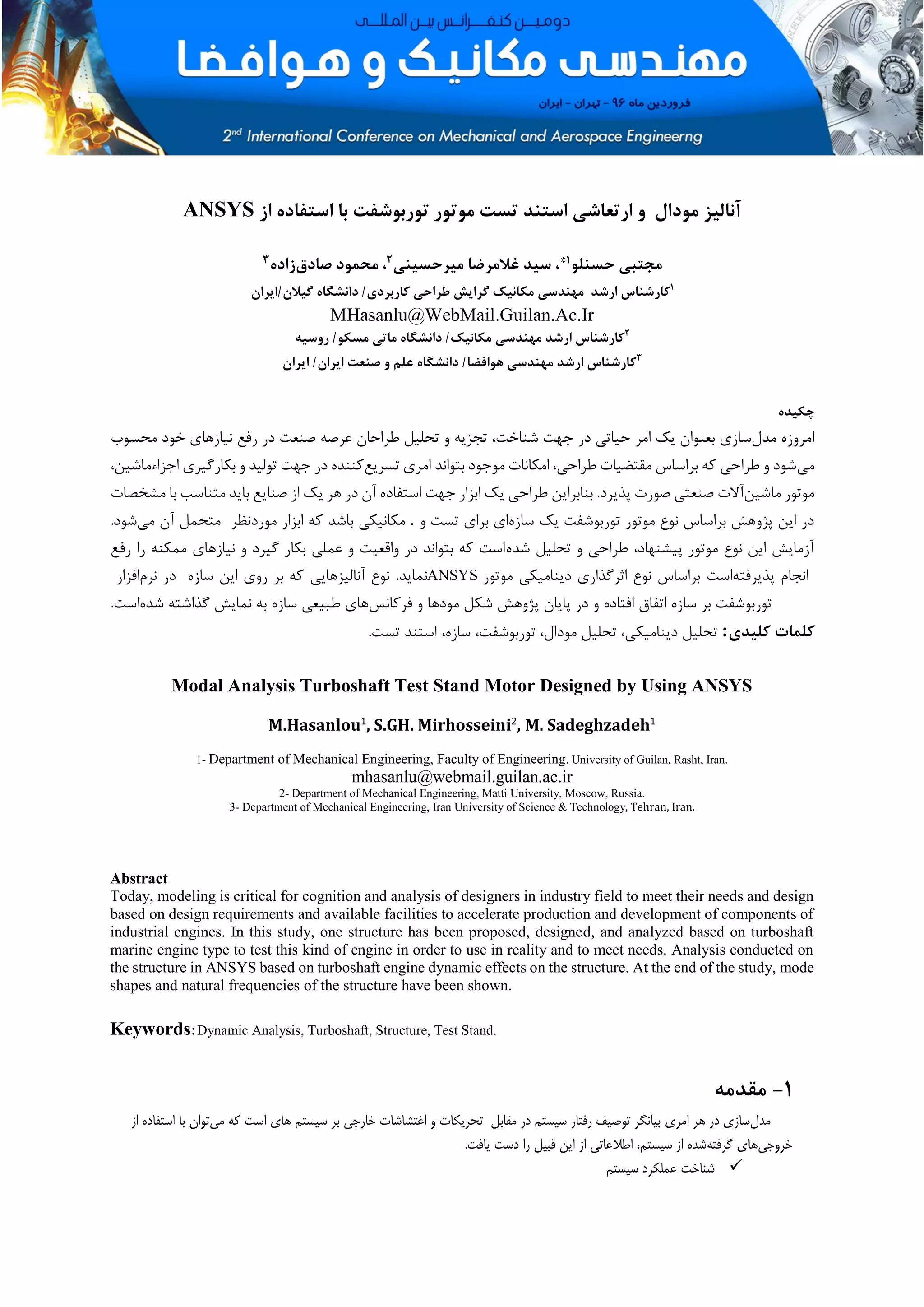 توربوشفت موتور تست استند ارتعاشی و مودال آنالیز ANSYS 3صادقزاده محمود ،2میرحسینی غالمرضا سید ،*1حسنلو مجتبی ایران/گیالن دانشگاه /کاربردی طراحی گرایش مکانیک مهندسی ارشد کارشناس1 MHasanlu@WebMail.Guilan.Ac.Ir روسیه /مسکو ماتی دانشگاه /مکانیک مهندسی ارشد کارشناس2 ایران /ایران صنعت و علم دانشگاه /هوافضا مهندسی ارشد کارشناس3 چکیده مدل امروزه امر یک بعنوان سازی عر طراحان تحلیل و تجزیه ،شناخت جهت در حیاتی ص رفع در صنعت ه محسوب خود نیازهای می تسریع امری بتواند موجود امکانات ،طراحی مقتضیات براساس که طراحی و شود اجزاء بکارگیری و تولید جهت در کننده ،ماشین ماشین موتور .پذیرد صورت صنعتی آالت ب نابراین طراحی یک ابزار جهت استفاده آن در هر یک از صنایع باید متناسب با مشخصات مکانیکی ب اشد که ابزار موردنظر متحمل آن می شود . . سازه یک توربوشفت موتور نوع براساس پژوهش این در و تست برای ای شده تحلیل و طراحی ،پیشنهاد موتور نوع این آزمایش رفع را ممکنه نیازهای و گیرد بکار عملی و واقعیت در بتواند که است نماید . نرم در سازه این روی بر که آنالیزهایی نوع افزار ANSYS پذیرفته انجام است موتور دینامیکی اثرگذاری نوع براساس و افتاده اتفاق سازه بر توربوشفت پژوهش پایان در شکل فرکانس و مودها گذاشته نمایش به سازه طبیعی های شده .است کلمات کلیدی : مودال تحلیل ،دینامیکی تحلیل ،توربوشفت ، تست استند ،سازه . Modal Analysis Turboshaft Test Stand Motor Designed by Using ANSYS M.Hasanlou1 , S.GH. Mirhosseini2 , M. Sadeghzadeh1 1- Department of Mechanical Engineering, Faculty of Engineering, University of Guilan, Rasht, Iran. mhasanlu@webmail.guilan.ac.ir 2- Department of Mechanical Engineering, Matti University, Moscow, Russia. 3- Department of Mechanical Engineering, Iran University of Science & Technology, Tehran, Iran. Abstract Today, modeling is critical for cognition and analysis of designers in industry field to meet their needs and design based on design requirements and available facilities to accelerate production and development of components of industrial engines. In this study, one structure has been proposed, designed, and analyzed based on turboshaft marine engine type to test this kind of engine in order to use in reality and to meet needs. Analysis conducted on the structure in ANSYS based on turboshaft engine dynamic effects on the structure. At the end of the study, mode shapes and natural frequencies of the structure have been shown. Keywords:Dynamic Analysis, Turboshaft, Structure, Test Stand. 1 - مقدمه مدل امری هر در سازی می که است های سیستم بر خارجی اغتشاشات و تحریکات مقابل در سیستم رفتار توصیف بیانگر اس با توان از تفاده خروجی گرفته های .یافت دست را قبیل این از اطالعاتی ،سیستم از شده سیستم عملکرد شناخت