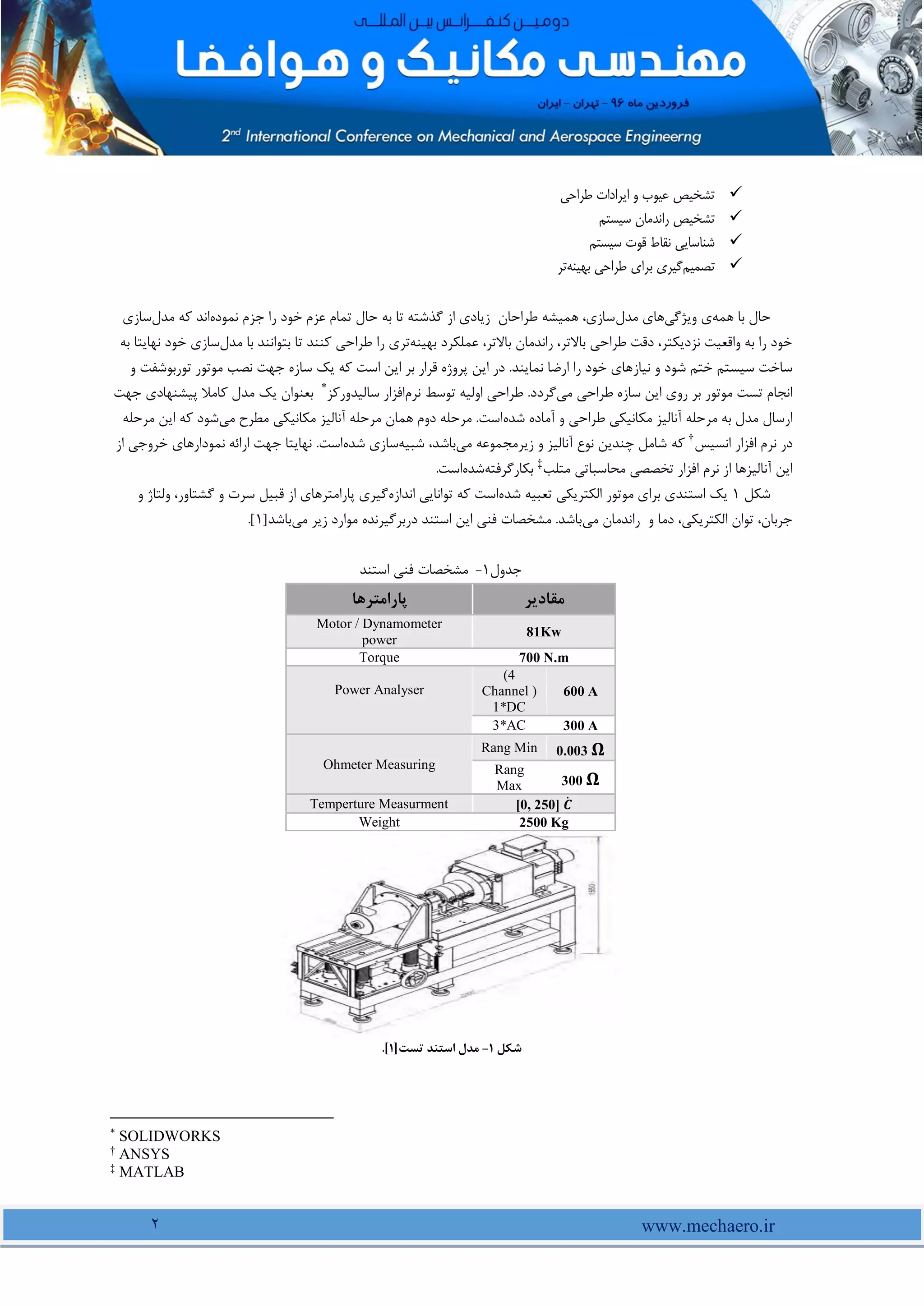 عیوب تشخیص سیستم راندمان تشخیص سیستم قوت نقاط شناسایی ت صمیم بهینه طراحی برای گیری تر همه با حال ویژگی ی مدل های نموده جزم را خود عزم تمام حال به تا گذشته از زیادی طراحان همیشه ،سازی مدل که اند سازی بهینه عملکرد ،باالتر راندمان ،باالتر طراحی دقت ،نزدیکتر واقعیت به را خود تر را ی مدل با بتوانند تا کنند طراحی سا ن خود زی به هایتا نیاز و شود ختم سیستم ساخت و توربوشفت موتور نصب جهت سازه یک که است این بر قرار پروژه این در .نمایند ارضا را خود های طراح سازه این روی بر موتور تست انجام می ی نرم توسط اولیه طراحی .گردد افزار سالیدورکز * جهت پیشنهادی کامال مدل یک بعنوان ارسال شده آماده و طراحی مکانیکی آنالیز مرحله به مدل می مطرح مکانیکی آنالیز مرحله همان دوم مرحله .است مرحله این که شود افزار نرم در انسیس † که زیرمجموعه و آنالیز نوع چندین شامل می ،باشد شبیه سازی شد ه از خروجی نمودارهای ارائه جهت نهایتا .است آنالیزها این ا نرم از محاسباتی تخصصی فزار متلب ‡ بکارگرفته شده .است شکل 1 شده تعبیه الکتریکی موتور برای استندی یک اندازه توانایی که است و ولتاژ ،گشتاور و سرت قبیل از پارامترهای گیری می راندمان و دما ،الکتریکی توان ،جربان می زیر موارد دربرگیرنده استند این فنی مشخصات .باشد باشد ] 1 [ . جدول 1 - استند فنی مشخصات مقادیر پارامترها 81Kw Motor / Dynamometer power 700 N.m Torque 600 A (4 Channel ) 1*DC Power Analyser 300 A 3*AC 0.003 𝛀 Rang Min Ohmeter Measuring 300 𝛀 Rang Max [0, 250] 𝑪̇ Temperture Measurment 2500 Kg Weight شکل 1 - تست استند مدل ] 1 [ . * SOLIDWORKS † ANSYS ‡ MATLAB