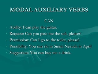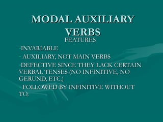This document provides information on modal auxiliary verbs in English. It discusses the features of modal verbs, including that they are invariable and defective since they lack certain verb tenses. It then defines and provides examples of usage for various modal verbs, including can, can't, could, be able to, may, might, must, mustn't, have to, need to, don't have to, mustn't, would, should, and ought to. It compares the uses of must and have to as well as should and ought to.