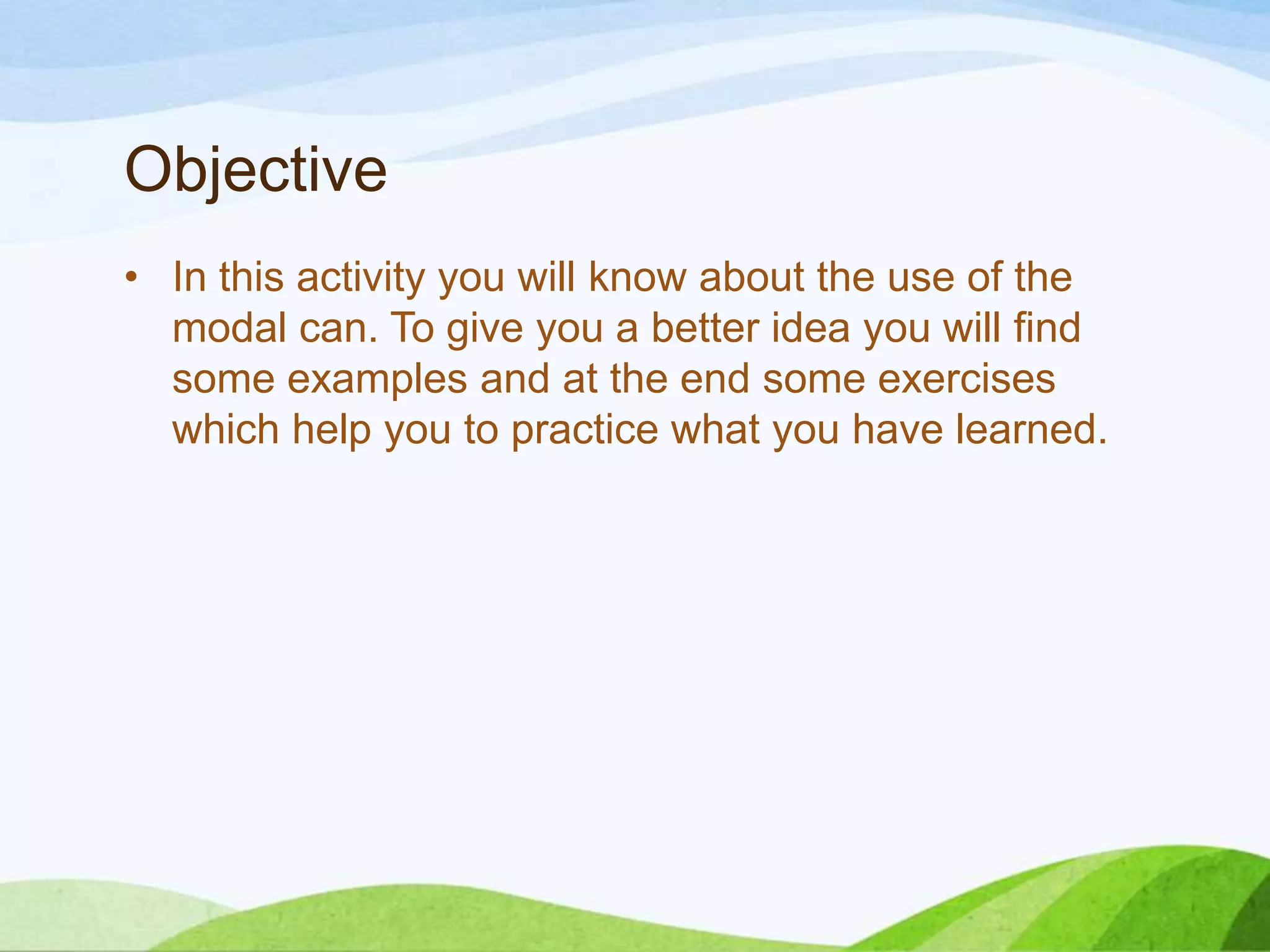 The document discusses the use of the modal verb "can" to express ability, opportunity, permission, and possibility. It provides examples of using "can" in the positive form like "I can snowboard" and "I can whistle", negative form, and interrogative form. Exercises are included for the reader to practice using "can" in sentences describing various abilities shown in a picture using these different forms.