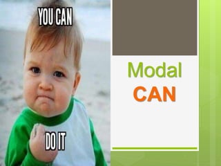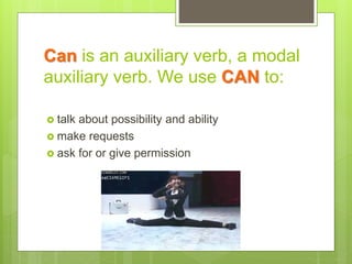 Can is a modal auxiliary verb used to talk about possibility and ability, make requests, and ask for or give permission. The basic structure is subject + can + main verb. Can is used to discuss what is possible and what one is able to do. It is also used to make requests by asking someone to do something, and to seek or grant permission for an action.