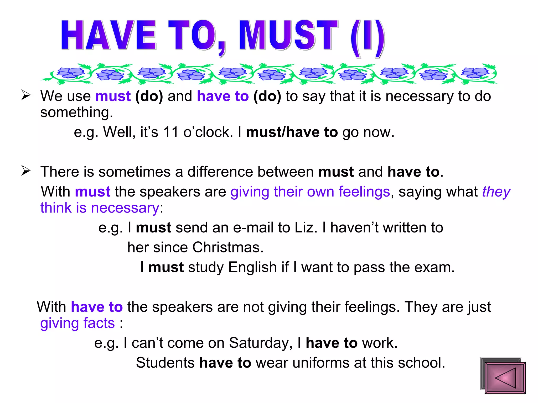 The document discusses the use of modal verbs including must, have to, should, and ought to. Must and have to are used to express necessity or obligation, with must expressing the speaker's own feelings and have to stating facts. Should is less strong than must and expresses giving advice or what is expected. Ought to is similar to should in expressing obligation or duty. The document provides examples of how each modal verb is used and exercises for the reader to practice using them correctly.
