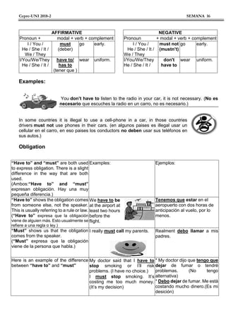 This document provides information about modal verbs in English. It discusses what modal verbs are, some of their key characteristics like never changing form and being followed by an infinitive without "to". It gives examples of common modal verbs like must, have to, don't have to. It covers using modal verbs to express obligation, permission and prohibition. It provides exercises to practice using modal verbs correctly in sentences.