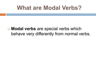 The document discusses modal verbs in English. Modal verbs are special verbs that behave differently than regular verbs. Some key points about modal verbs include: 1) they do not take "-s" in the third person, 2) "not" is used to make them negative, and 3) many cannot be used in past or future tenses. Common modal verbs are defined and examples are provided for can, could, may, might, must, shall, should, will, and would. Their uses relate to ability, permission, possibility, necessity, advice, and more.