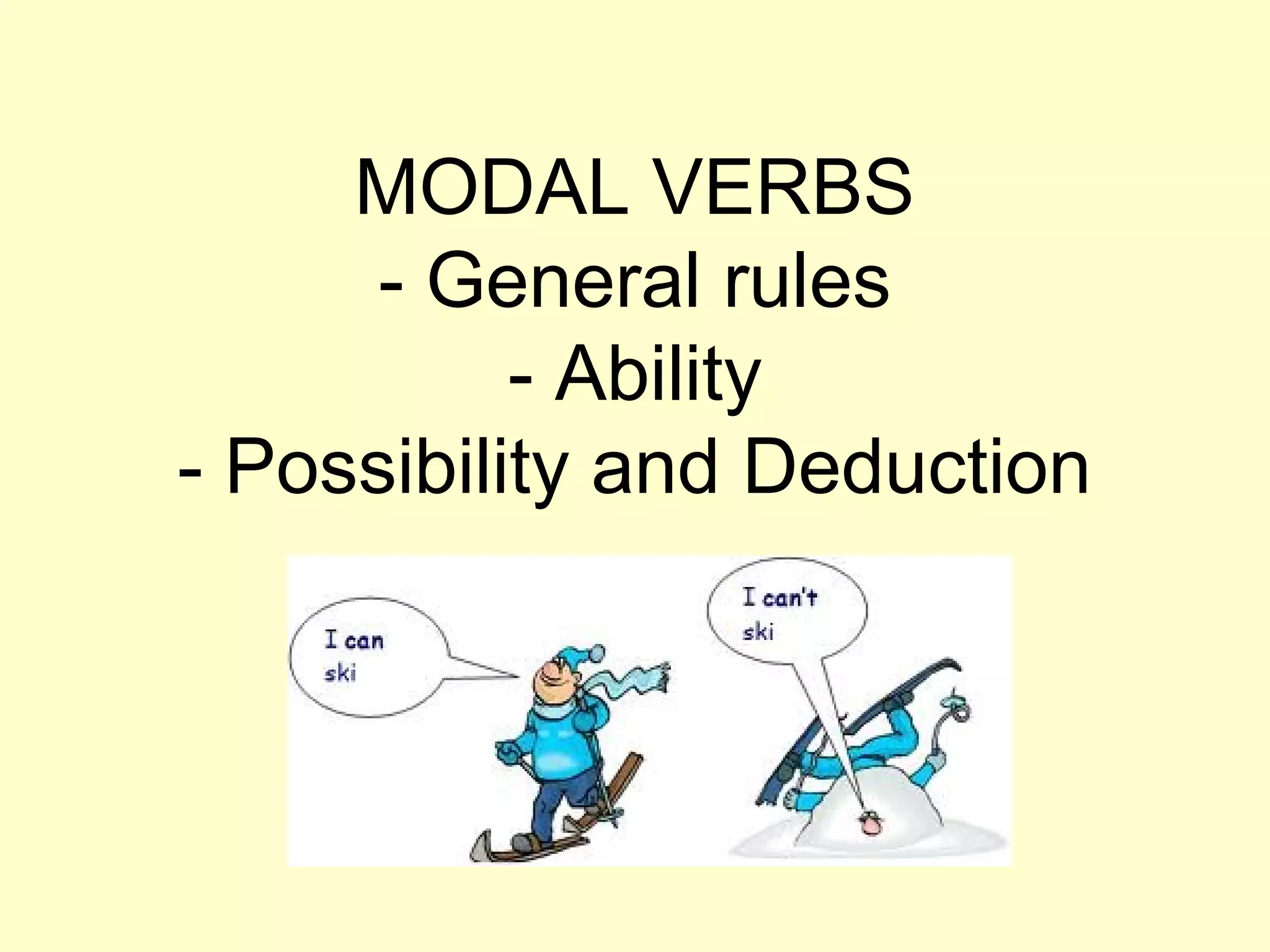 Modal verbs have special rules regarding conjugation and usage. They are used to express ability, possibility, deduction, permission and obligation. Modal verbs include can, could, may, might, must, shall, should, ought to, and be able to. They have no inflected forms and are followed by the bare infinitive of other verbs. Modal verbs are used to talk about abilities and skills in the present or past, express possibilities and deductions, and discuss obligations or permissions.