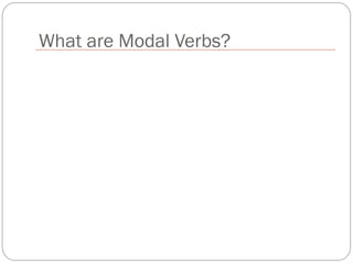The document defines and explains modal verbs. It states that modal verbs are auxiliary verbs that provide additional meaning to the main verb of a sentence. Some common modal verbs are can, could, may, might, must, shall, should, will, would, and ought to. The document then discusses how modal verbs are used, including that they do not conjugate or use other auxiliary verbs. It also notes that modal verbs do not have infinitives, -ing forms, or all tenses. Modal verbs use other verbs like be able to or have to to complete their tenses. Finally, the document provides examples of modal verb usage.