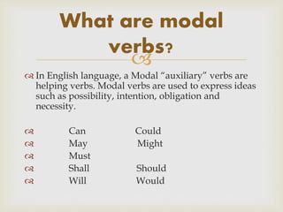 This document provides information about modal verbs in English. It begins by defining modal verbs as helping verbs that express ideas such as possibility, intention, obligation and necessity. It lists common modal verbs like can, may, must, shall, should and will. It then discusses specific grammatical rules for modal verbs, such as not taking -s, -ing or -ed forms. It provides examples of how modal verbs are used in different tenses and to express different meanings like ability, permission, necessity, etc. It also discusses past modal forms that are used to make deductions about the past. Overall, the document serves as a guide to the meaning and proper use of modal verbs in English.