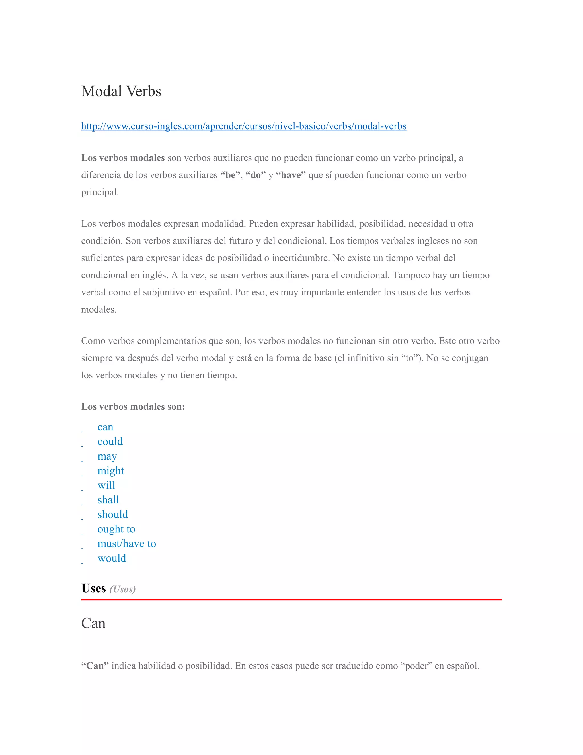 Los verbos modales son verbos auxiliares que expresan modalidad como habilidad, posibilidad, necesidad u otra condición. No se conjugan y siempre van seguidos de otro verbo en forma base. Los verbos modales más comunes son can, could, may, might, will, shall, should, ought to, must y would. Cada uno tiene usos específicos para indicar posibilidad, obligación, permiso o preferencia dependiendo del contexto.