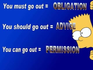 Modal verbs are used to express obligation, permission, possibility, and other attitudes. Some common modal verbs include must, should, can, may, might, will, would, shall, and ought to. Modal verbs have certain grammatical features - they are invariable, do not require do-support in questions and negatives, and are followed by the bare infinitive form of other verbs. Other verbs like have to, be able to, and need to share some uses and meanings with modal verbs as well.