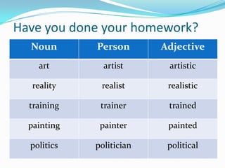 This document discusses the differences between modern art and graffiti. It notes that modern art artists typically have classical art training, while graffiti artists usually do not have artistic training. It also provides examples of conversations where people analyze and interpret meanings behind a strange modern art painting depicting a sleeping woman surrounded by red. The document concludes with examples of using modal verbs like "is", "can", "might" to express degrees of certainty or uncertainty about something potentially being a car.