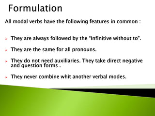 This document discusses the differences between modal verbs like can, could, may, and might. It provides examples of how each modal verb is used, including their use in questions, negatives, and different tenses. The key differences are that can and may express present possibility while could and might express past or uncertain possibility. It also notes that may should be avoided in third conditional sentences.