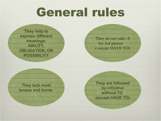 This document introduces modal verbs and their uses to express ability, obligation, and possibility in English. It provides examples of common modal verbs like can, could, have to, must, might, and may and how they are used in the affirmative, negative, and questions. It also distinguishes how must and have to are used to express obligation and prohibition versus absence of obligation. Finally, it gives examples of modal verbs that express certainty versus possibility.
