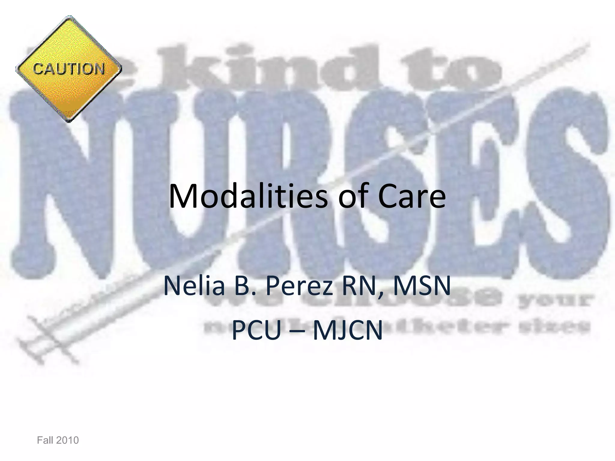 This document discusses different modalities of patient care delivery including total patient care, functional nursing, team nursing, primary nursing, and case management. It explains the key aspects of each approach and how they affect factors like continuity of care, role clarity, efficiency, and communication. The document also covers challenges for the future like cost containment, quality demands, and changing patient and workforce demographics. It emphasizes the importance of carefully designing care delivery models that are not solely based on economics and facilitate innovative solutions through integrated leadership and adequate resources.