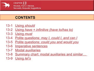 This document contains a teacher resource on English modal verbs and expressions. It includes 13 sections that provide examples, explanations and exercises on using verbs like "should", "have to", "must", "may", "let's" and others. The slides cover common usages, question forms, negatives and summaries of modal meanings in clear tables. Interactive exercises allow typing answers directly on the slides.