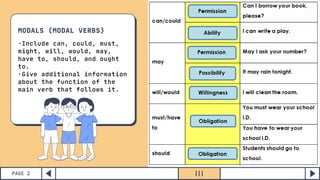 Modal verbs show possibility, intent, ability, or necessity and are used together with the main verb. Modal verbs include can, could, must, might, will, would, may, have to, and should. As auxiliary verbs, modal verbs do not change form or require additional auxiliaries, and are followed directly by the bare infinitive verb without "to". Modal verbs are used to express hypothetical conditions, permission, suggestions, obligations, abilities, and possibilities.