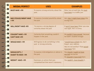 Modal verbs are auxiliary verbs that provide additional meaning to the main verb of a sentence. There are several modal verbs including can, could, may, might, must, shall, should, will, would, and ought to. Modal verbs do not conjugate or take other auxiliary verbs. They are used to express concepts like permission, obligation, possibility, ability, advice, and past habits. Modal verbs are categorized as single concept, double concept, or past modals depending on their meaning. Examples are provided to illustrate the different uses and meanings of various modal verbs.