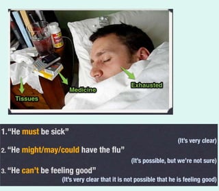 The document discusses modals used for speculation in English. It explains that "must" is used when something is sure to be possible or true, "can't" is used when something is sure to not be possible, and "might", "may", and "could" are used when the speaker is unsure. It provides examples of changing sentences to use these modals correctly based on levels of certainty. The document concludes by having the reader make sentences using pictures and modals to express different levels of speculation.