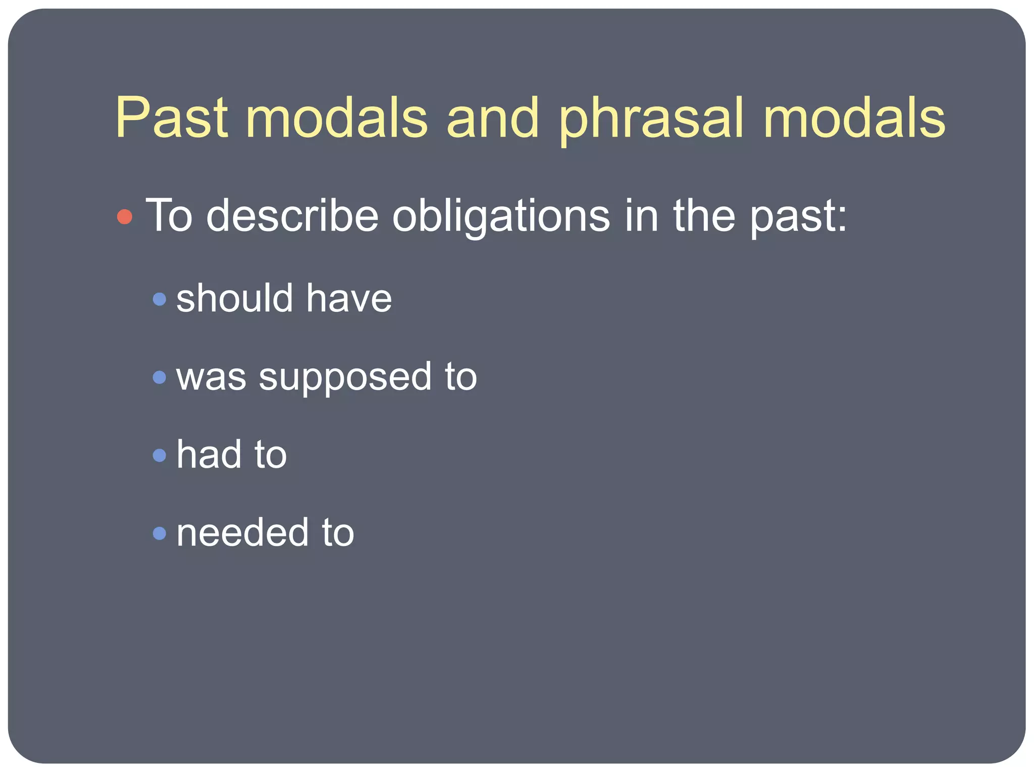 This document discusses past modals and phrasal modals used to describe obligations in the past, including: should have, was supposed to, had to, and needed to. It provides examples of how each modal is used to indicate: strong obligation, expectation, advisability, necessity, and no obligation in past situations.