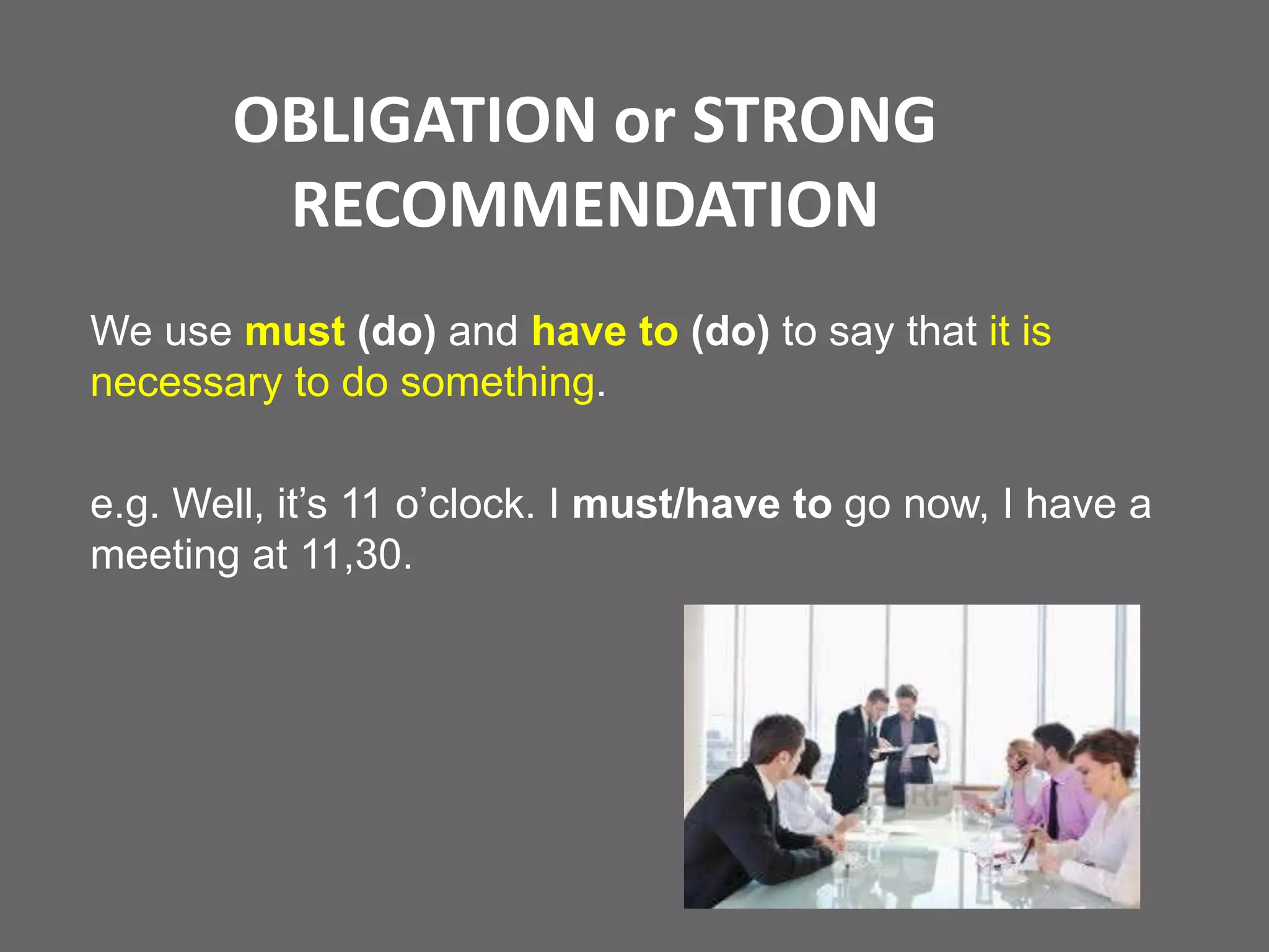 The document discusses different modals of obligation in English including must, have to, should, and ought to. It explains that must and have to express obligation or strong recommendation, with must expressing the speaker's own feelings and have to stating facts. Must can only be used for present and future tense while have to can be used in all tenses. Should and ought to are used to give advice or opinion. You mustn't indicates prohibition. You don't have to means there is no obligation. Examples are provided to illustrate the usage of each modal.