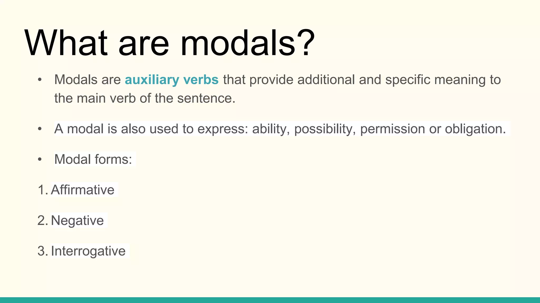 Modals are auxiliary verbs that provide additional meaning to the main verb. They express ability, possibility, permission or obligation. There are several types of modals: can, could, be able to, may, do you mind if.