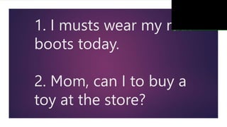 This document provides 20 sentences with grammatical errors and asks the reader to identify the error in each sentence and rewrite it correctly. The errors include incorrect verb forms, incorrect question formation, incorrect placement of adverbs, and subject-verb agreement issues. The reader is to analyze each sentence, identify the error, and rewrite the sentence correctly.