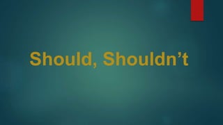 The document discusses different modal verbs including should, shouldn't, can, can't, have to, and don't have to. It provides examples of their uses and rules for when each modal verb is appropriate. Specifically, it explains that should and shouldn't are used for giving advice or stating what is necessary or a good idea. Can and can't refer to ability, while have to and don't have to refer to obligations or lack thereof. The document also includes exercises for students to practice using these modal verbs in different contexts.