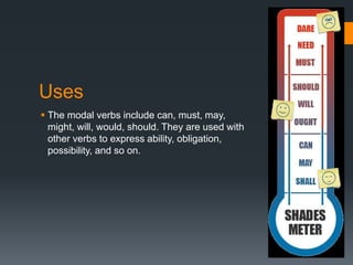 Modals verbs like can, may, must, will are used to express ability, obligation, possibility. Unlike other verbs, modal verbs do not change form or have infinitives/participles. They are used with other verbs to express things like ability, obligation, or possibility. Common mistakes include using an additional auxiliary verb when a modal is used, like "do I must come?" Modal verbs have specific uses - can is ability/possibility, may is permission/possibility, will is for instant decisions and predictions.