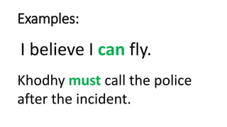 Modals are helping verbs that express concepts like permission, obligation, and prohibition. Some common modals are: