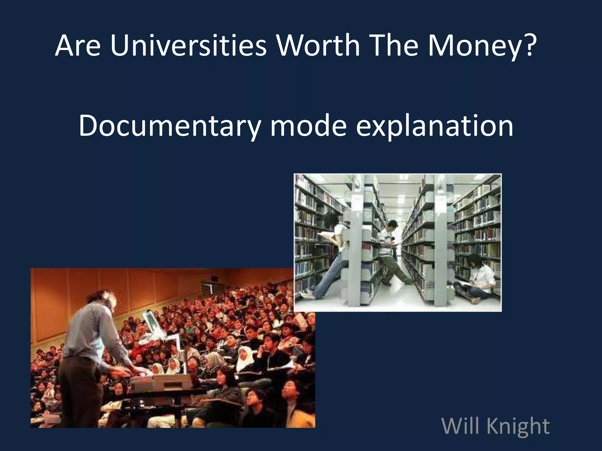 The document discusses the mode that will be used to create a documentary about whether universities are worth the money. It will take a reflexive approach, where the filmmaker is present on camera interviewing subjects. This mode allows the issues around the topic to be clearly conveyed to audiences. The documentary will also have an expository nature, educating viewers on the current state of university fees through statistics, figures, and opinions. Reflexive and expository modes were chosen over poetic, observational, or participatory modes as being most effective for the topic.